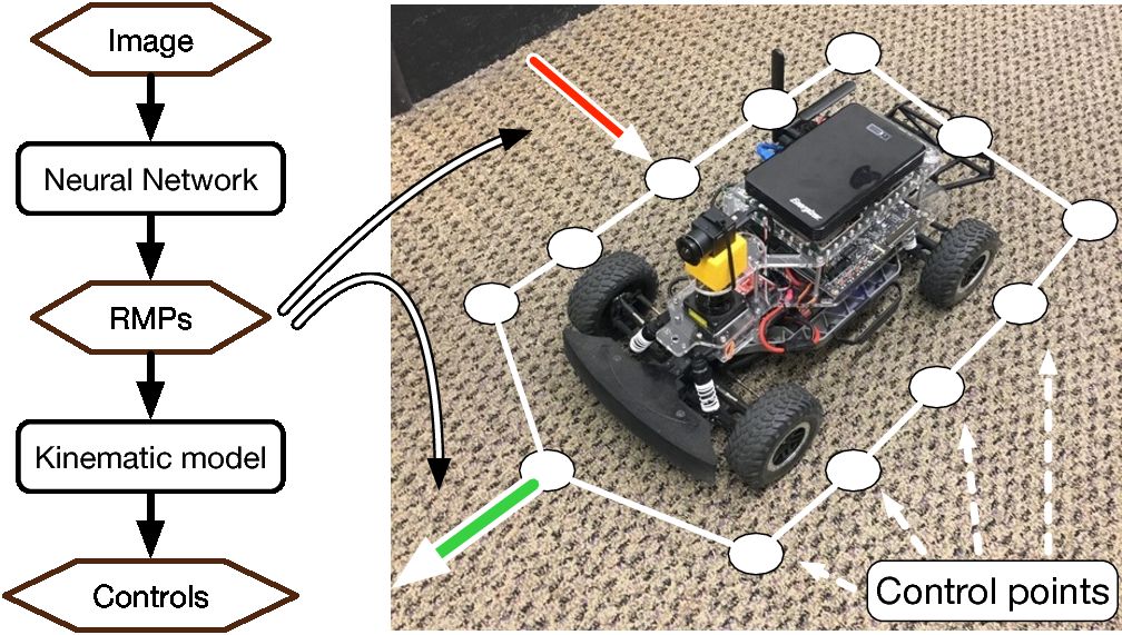 [paper] [website] [code] End-to-end learning for autonomous navigation has received substantial attention recently as a promising method for reducing modeling error. However, its data complexity, especially around generalization to unseen environments, is high. We introduce a novel image-based autonomous navigation technique that leverages in policy structure using the Riemannian Motion Policy (RMP) framework for deep learning of vehicular control. We design a deep neural network to predict control point RMPs of the vehicle from visual images, from which the optimal control commands can be computed analytically. We show that our network trained in the Gibson environment can be used for indoor obstacle avoidance and navigation on a real RC car, and our RMP representation generalizes better to unseen environments than predicting local geometry or predicting control commands directly.